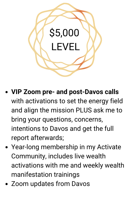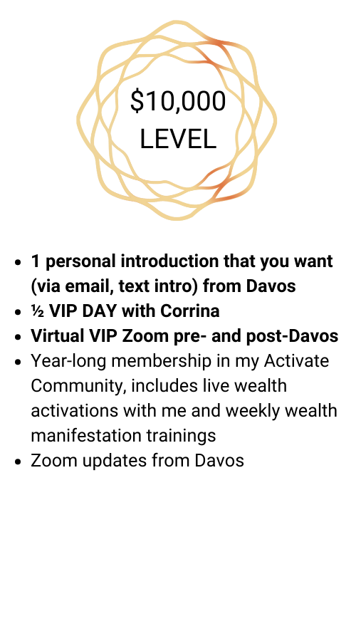I am the CEO & founder of Soul Wealth Coaching, a 7-figure business I created while working from home as a mom. A former United Nations consultant, I woke up spiritually in the midst of my career and received the new wealth consciousness that is essential for all spiritually conscious entrepreneurs. I am an Angelic Reiki master, energy realignment specialist and wealth activator. I believe with my full heart that, together, we CAN create a new world that honors the sacred, the soul of humanity, the planet & her ecosystems, heals rather than divides, creates rather than destroys. I am humbled that I get to represent your heart, your dreams and be your ally as I stepped into the journey of Davos. I am infinitely grateful for your love and support.